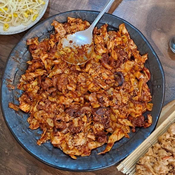 주꾸미는 불 맛이 강하고, 순한 맛 기준 초등학생도 무난하게 먹을 수 있는 수준입니다. 이걸 맵게 만들어 달라고 하면 얼마나 매워질지는 모르겠네요.